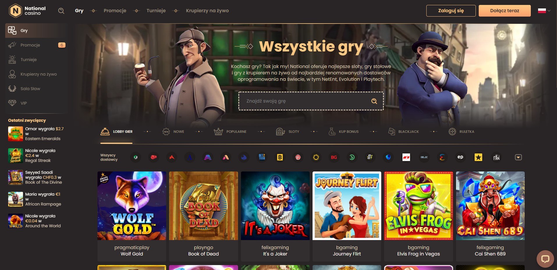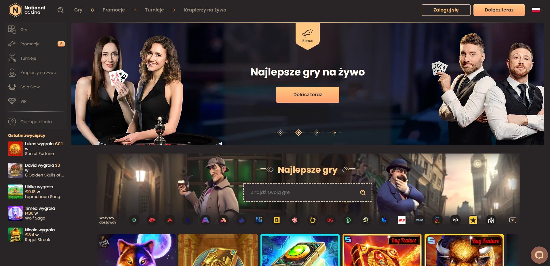 W National Casino sloty to naprawdę świetna rozrywka. Kasyno współpracuje z najlepszymi producentami i dba o aktualizowanie swojej oferty. Na pewno spotkacie się z tytułami, które nie występują u innych kasyn właśnie ze względu na bieżące aktualizacje w National Casino. Warto również zwrócić uwagę na to, że gracze z Polski nie mają żadnych problemów z przejściem procedury rejestracji, co bywa problemem w niektórych kasynach online. Strona kasyna jest dostępna w języku polskim i National Casino jest otwarte na doładowania salda z wykorzystaniem naszej rodzimej waluty.